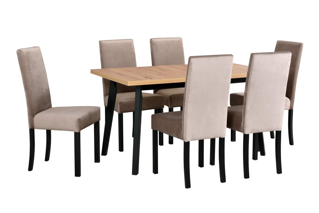 Jídelní set Oslo 5 + Roma 2 Sestava nabízí jídelní stůl s možností rozkladu a šest židlí s čalouněným sedákem a opěradlem. Jídelní set je v klasické kombinaci artisan a černé barvy. Materiál: laminátová deska + masiv - buk Barevné provedení: deska stolu: lamino artisan nohy stolu: moření černé korpus židle: černá potahová látka židlí: 27B Rozměry stolu: šířka: 80 cm délka: 140 / 180 cm výška: 75 cm Rozměry židlí: šířka: 45 cm hloubka: 41 cm celková výška: 97 cm výška sedu: 48 cm Dodáváme v demontu s podrobným instruktážním návodem. Objednat si také můžete naše služby: montáž na místě, výnos do patra a nebo ekologickou likvidaci starého nábytku. Zájem o služby přidejte do košíku v objednávce. Najdete mezi kategoriemi Ceník služeb nebo níže v odkazu. https://www.nabytekpaul.cz/cenik-sluzeb/ Zboží dodáváme vlastní dopravou.V našem obchodě najdete nejvýhodnější ceny. Pokud budete spokojeni, doporučte nás prosím svým známým.