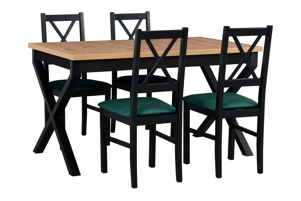 Sestava nabízí jídelní stůl s možností rozkladu a čtyři židle s čalouněným sedákem. Jídelní set je v kombinaci odstínu wotan a černé barvy.