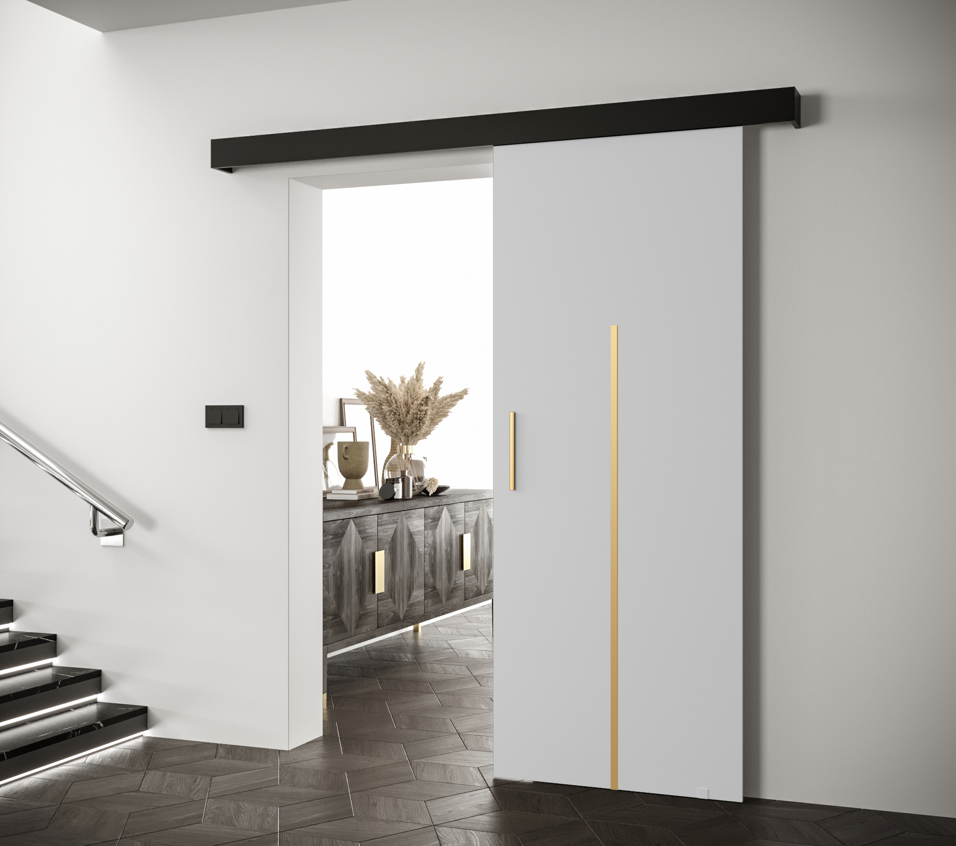 Popis produktu Posuvné dveře Salwador X Dveře: Bíle mat, Pásky / úchyty: Zlatý, Horní pojezdová lišta: Dub Sonoma