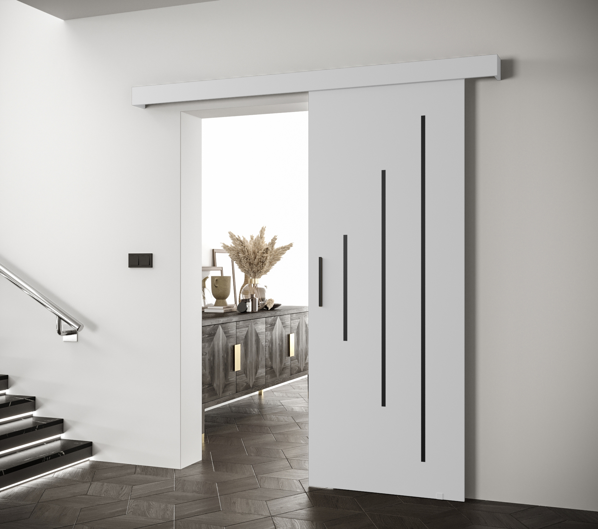 Popis produktu Posuvné dveře Salwador Y Dveře: Bíle mat, Pásky / úchyty: Zlatý, Horní pojezdová lišta: Bílá