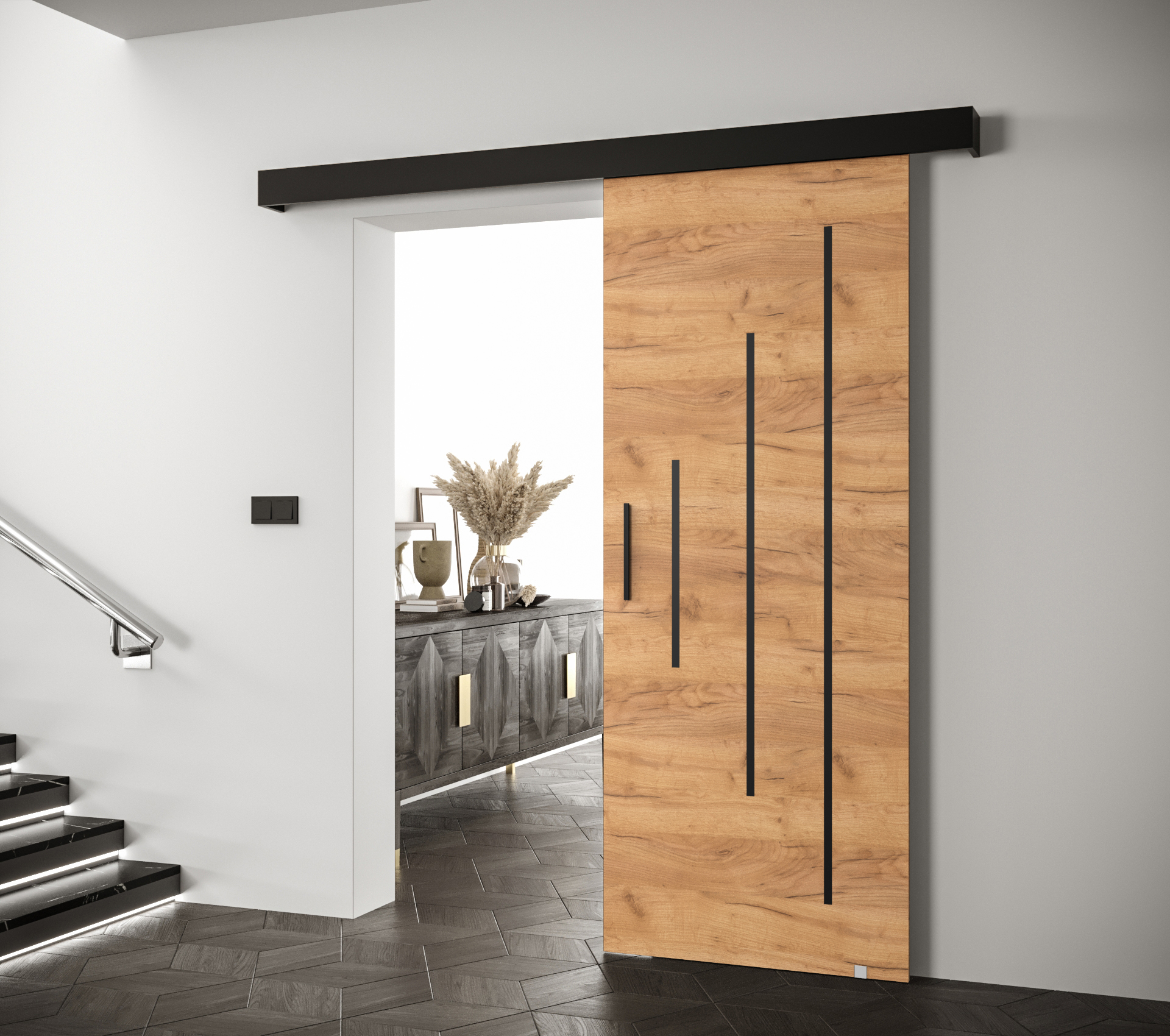 Popis produktu Posuvné dveře Salwador Y Dveře: Craft zlatý, Pásky / úchyty: stříbrné, Horní pojezdová lišta: Craft zlatý