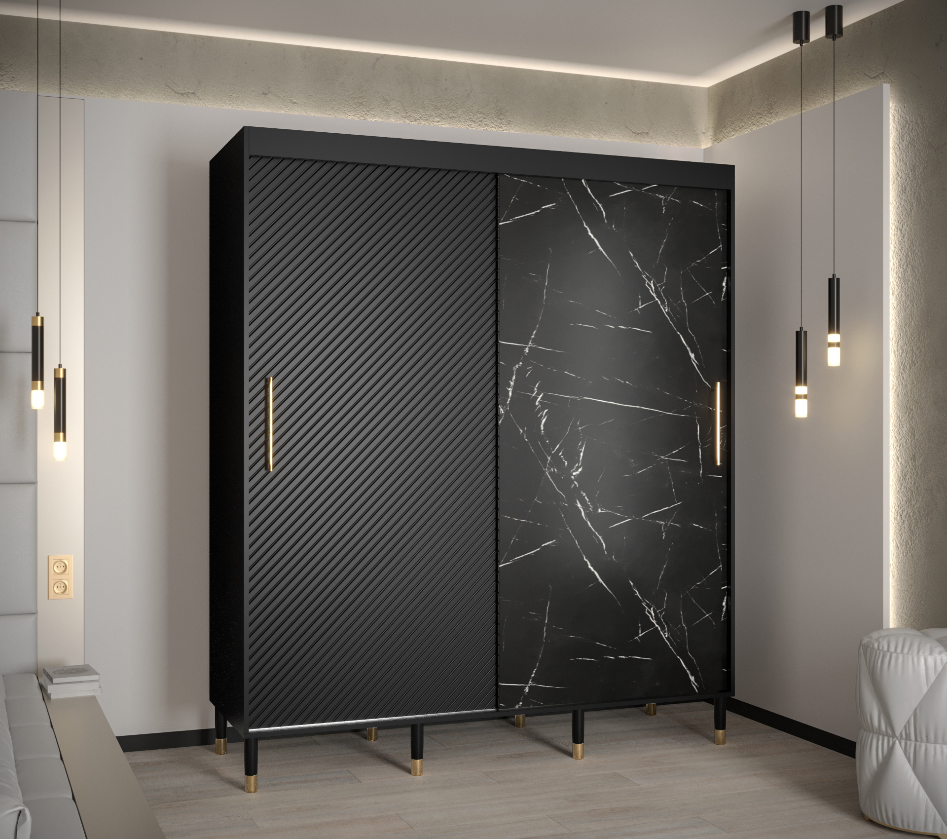 Šatní skříň Abi Calipso Jodelka Marmur je dostupná v černé a bílé barvě doplněné o imitaci mramoru. Barevná varianta je doplněna zlaté detaily v podobě úchytů a zakončením na nožičkách.